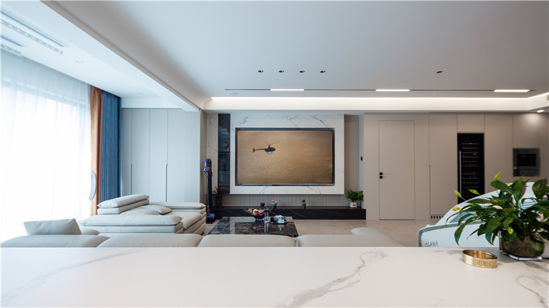白色大理石懸挑電視背景墻,以格柵造型打底,留有黑玻展示柜,增加客廳的縱深感與層次感。