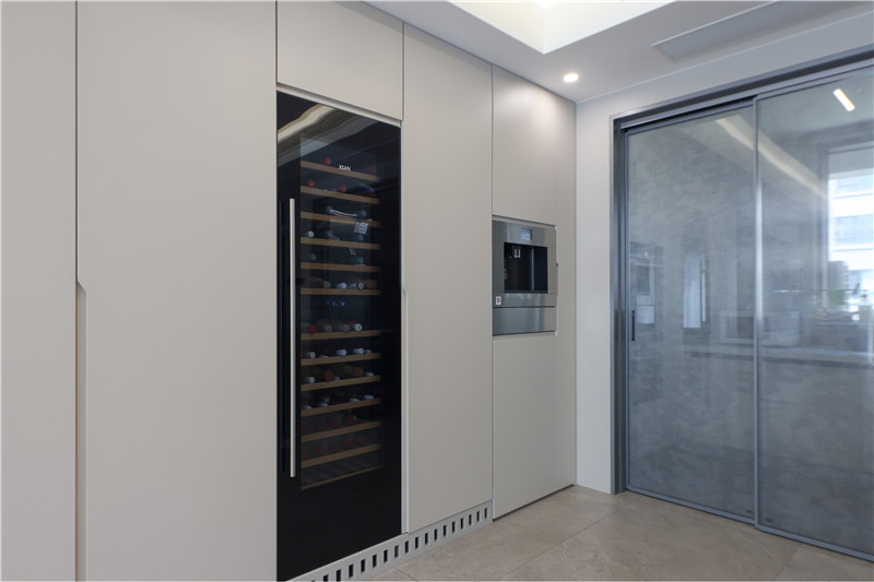 靠墻做整面餐邊柜,將冰箱嵌入其中,隱藏式設(shè)計(jì)更美觀(guān)。無(wú)把手的整面高柜給人簡(jiǎn)潔視覺(jué)體驗(yàn),不管是銑型拉手的細(xì)節(jié)還是板材的接縫處,都將工藝做到盡善盡美。