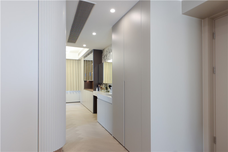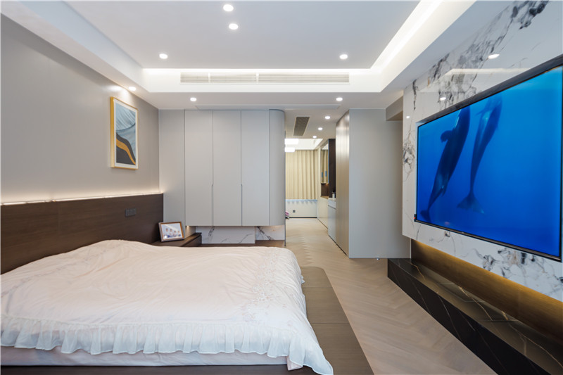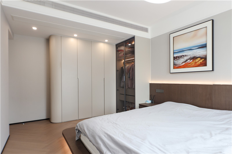 推開(kāi)與餐邊柜相連的門(mén)即進(jìn)入主臥空間,打通了衛(wèi)生間和衣帽間的設(shè)計(jì)讓主臥變身功能性十足的高品質(zhì)臥房。