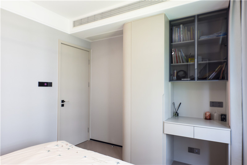 男孩房的設(shè)計(jì)上除了基礎(chǔ)的睡眠區(qū)和收納區(qū)還增設(shè)了一個(gè)學(xué)習(xí)區(qū),穿插的設(shè)計(jì)手法減少了小空間內(nèi)高柜的壓抑感,在滿(mǎn)足實(shí)用性的同時(shí)提升居住的舒適度。
