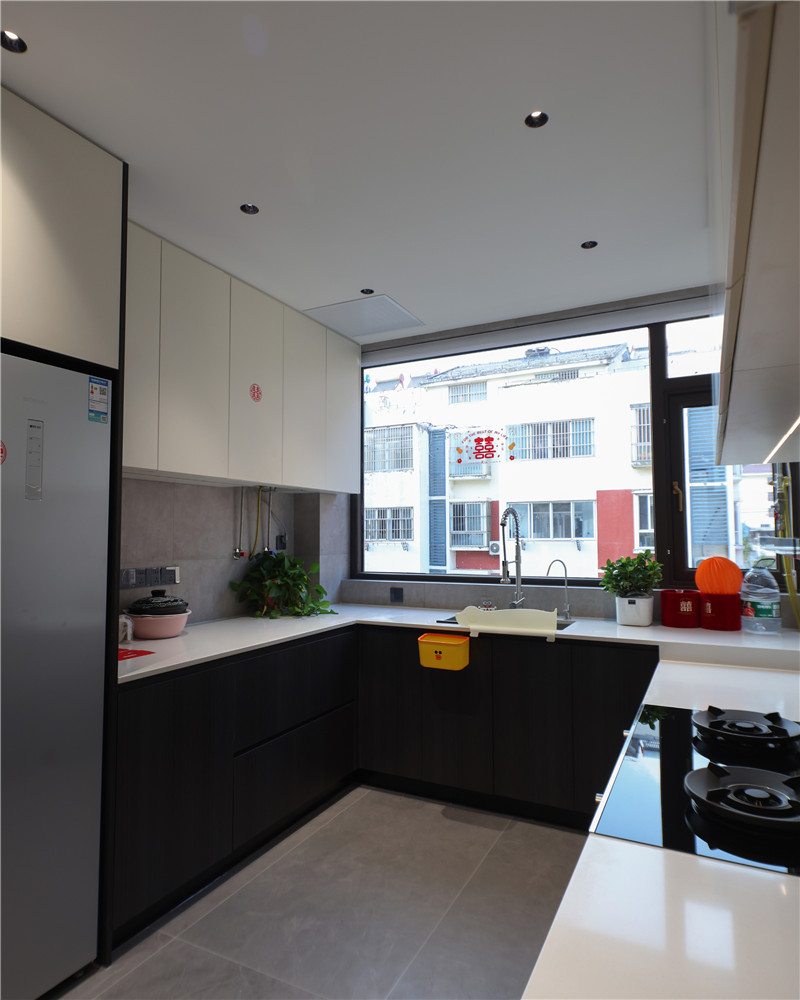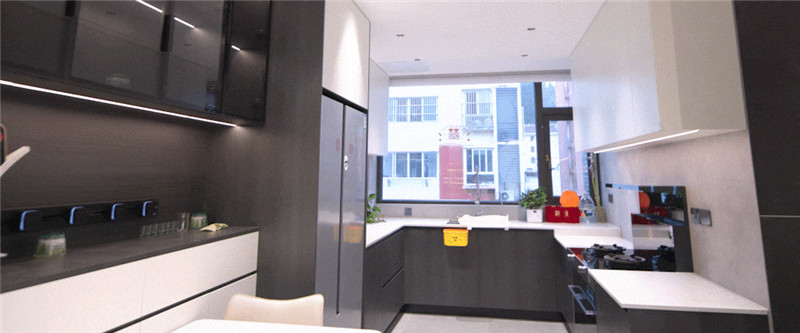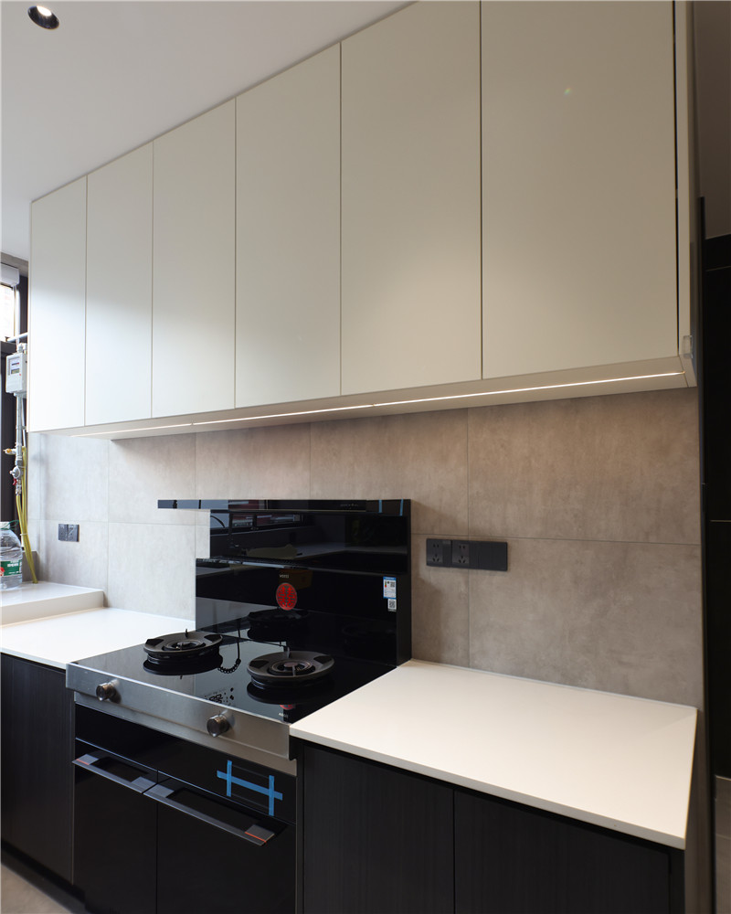 廚房U字型布局,遵循洗→切→烹→盛的動(dòng)線,便捷且收納力強(qiáng);櫥柜箱體及吊柜采用無拉手設(shè)計(jì),視覺清新;整體臺(tái)面巖板運(yùn)用,耐磨防滲水;冰箱與柜體組合,協(xié)調(diào)整體空間布局。