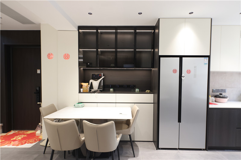 到頂餐邊柜,采用芬蘭白門板與黑木紋柜體,跳色設(shè)計(jì)更具視覺沖擊力;中部掏空預(yù)留,可放小物件及咖啡機(jī)等小電器。