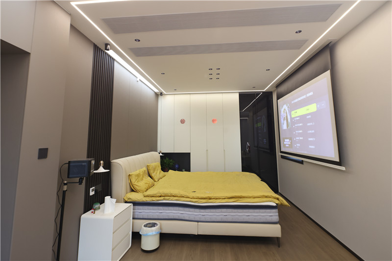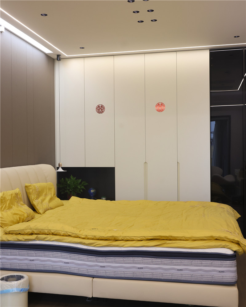 臥室一側(cè)整面立柜,配合銑槽拉手簡約利落;梳妝臺(tái)抬高設(shè)計(jì),融入圓弧造型,典雅溫柔;整體空間主燈與輔燈相結(jié)合式設(shè)計(jì),空間層次感強(qiáng)。