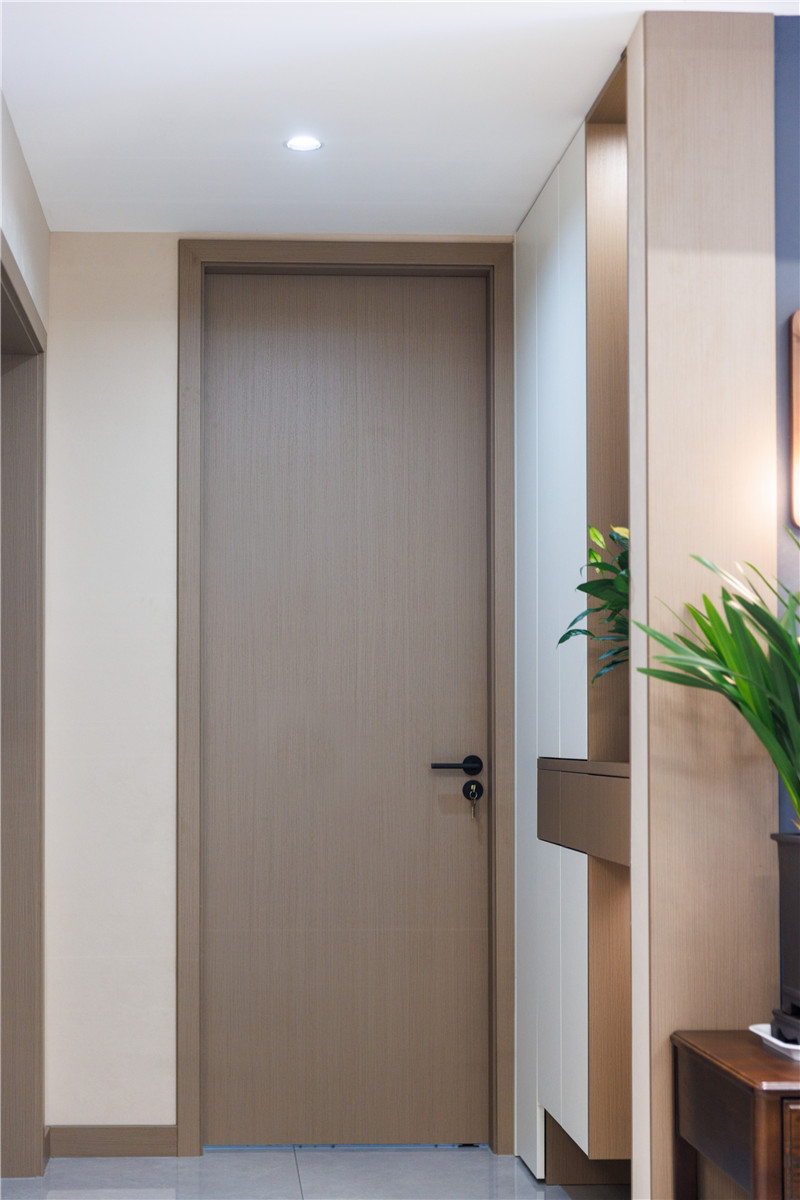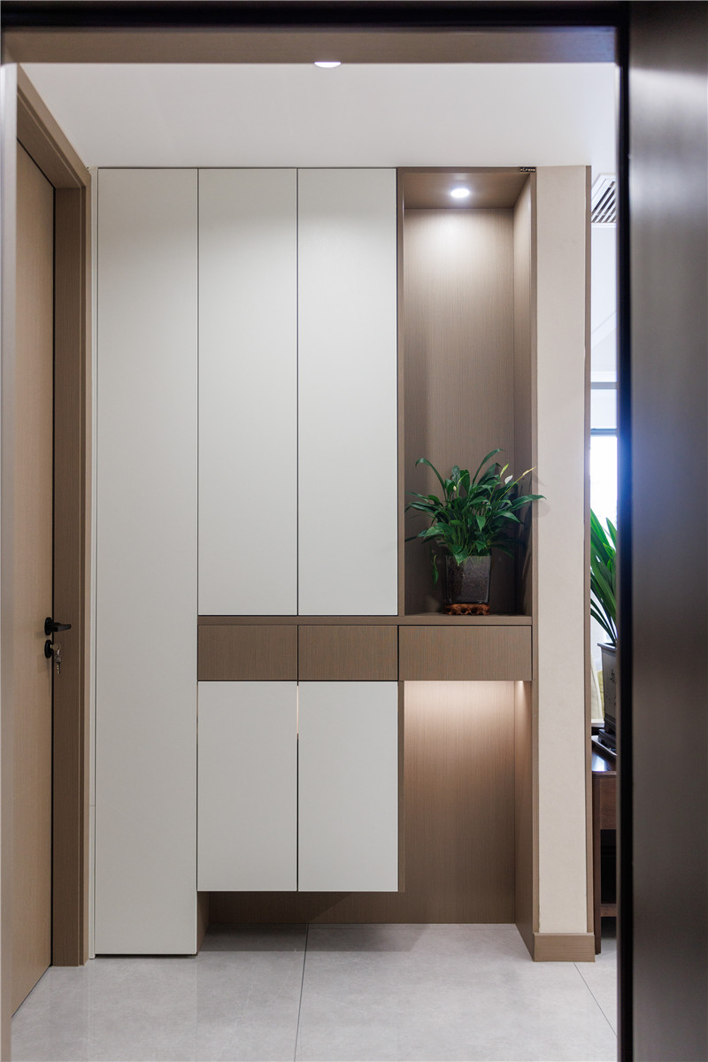 玄關(guān)柜設(shè)計(jì)遵從簡(jiǎn)單設(shè)計(jì)手法,選用科技直紋與蘭迪白作拼色設(shè)計(jì)增添時(shí)尚感,讓空間不單調(diào);門墻柜一體化選用客來(lái)??萍贾奔y,更加自然百搭。