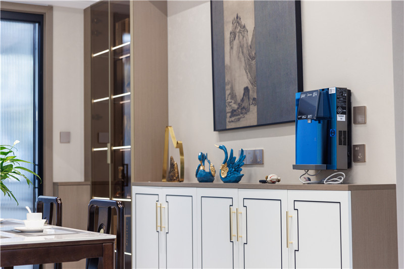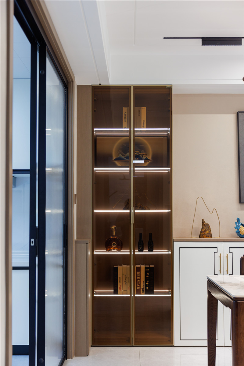 餐邊柜設(shè)計(jì)選用了矮柜+2組玻璃高柜,矮柜具有濃烈的中式風(fēng)格,黑色方形刻線+金色拉手,既大方美觀又簡(jiǎn)單高雅;玻璃高柜的選用,為餐廳增添一絲奢華氛圍。