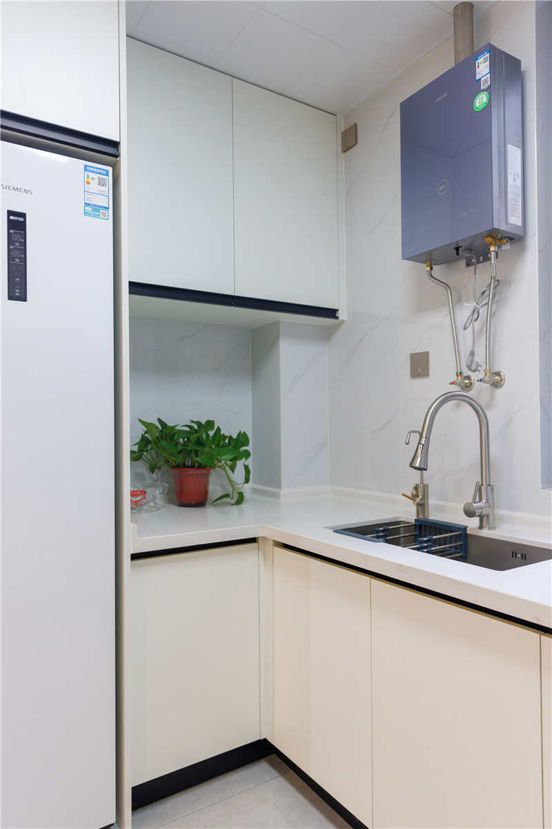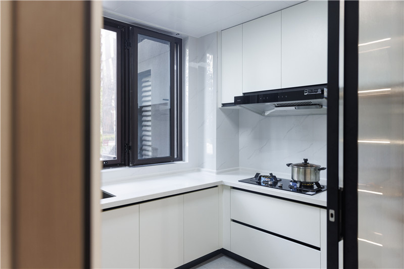 廚房面積有限,選用U型櫥柜設(shè)計(jì)合理的運(yùn)用空間,蘭迪白與免拉手設(shè)計(jì),使得空間簡(jiǎn)潔干凈,符合廚房應(yīng)有的基調(diào)。