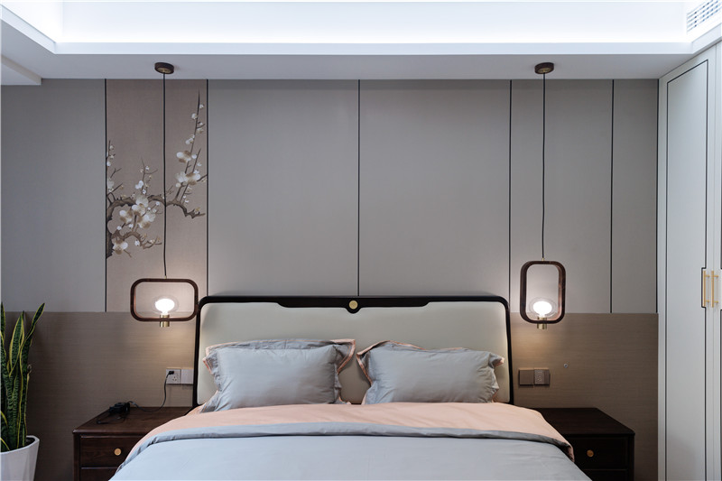 背景墻不規(guī)則的現(xiàn)代設(shè)計(jì)與中式古畫的理想糅合,再配合新中式床頭燈,整體既清新古風(fēng),又符合現(xiàn)代人審美。