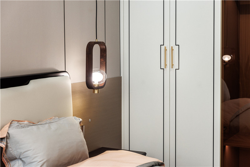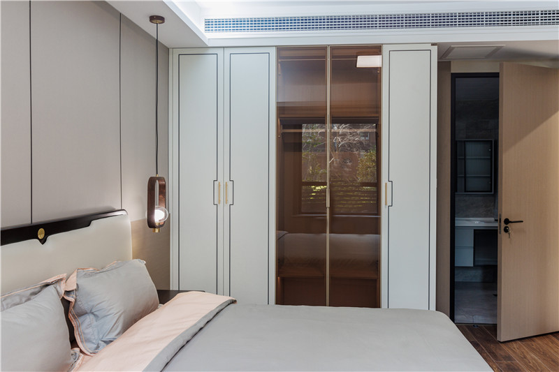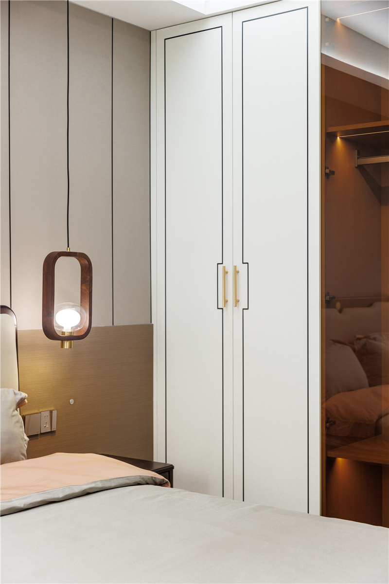 主臥延續(xù)了餐邊柜的配色設(shè)計(jì),蘭迪白與科技直紋的恰到好處融合,充分發(fā)揮新中式的淡雅魅力。