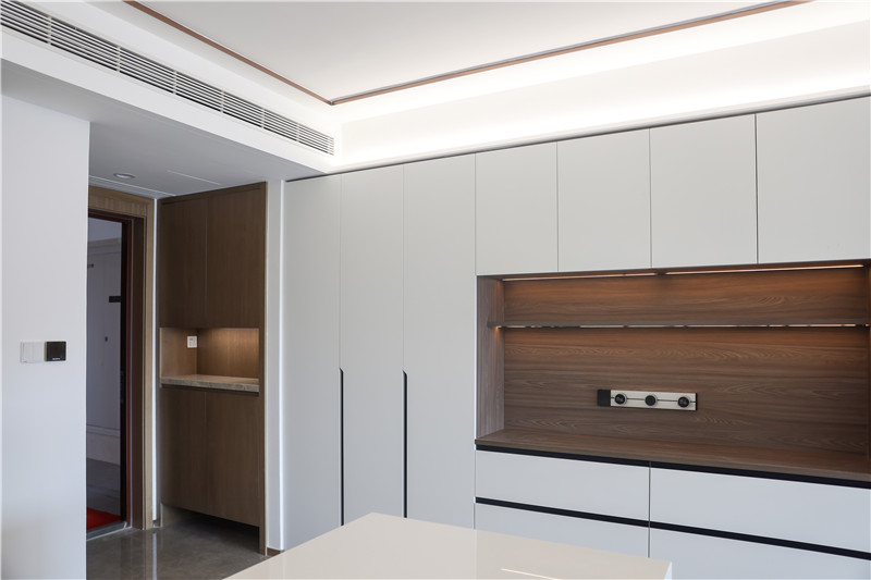 餐邊柜與玄關(guān)相連,整體一字型構(gòu)造,其莫蘭迪水漆純白色與黑玻形成跳色,增強空間美感;立柜+吊柜+抽屜柜,提升空間收納力;銑槽長拉手,簡約利落。