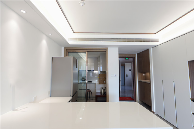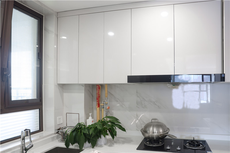 廚房貼墻而建呈小U字型構(gòu)造,無拉手設(shè)計使得整體視覺清新,簡單幾平米的烹飪區(qū),動線明晰、存儲在線。