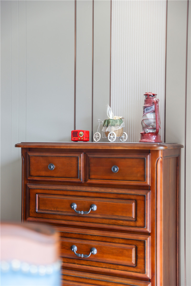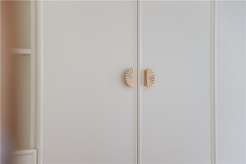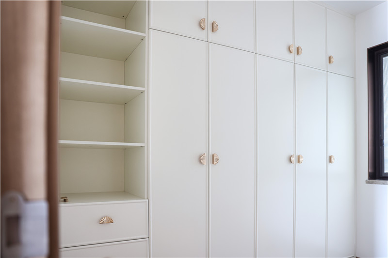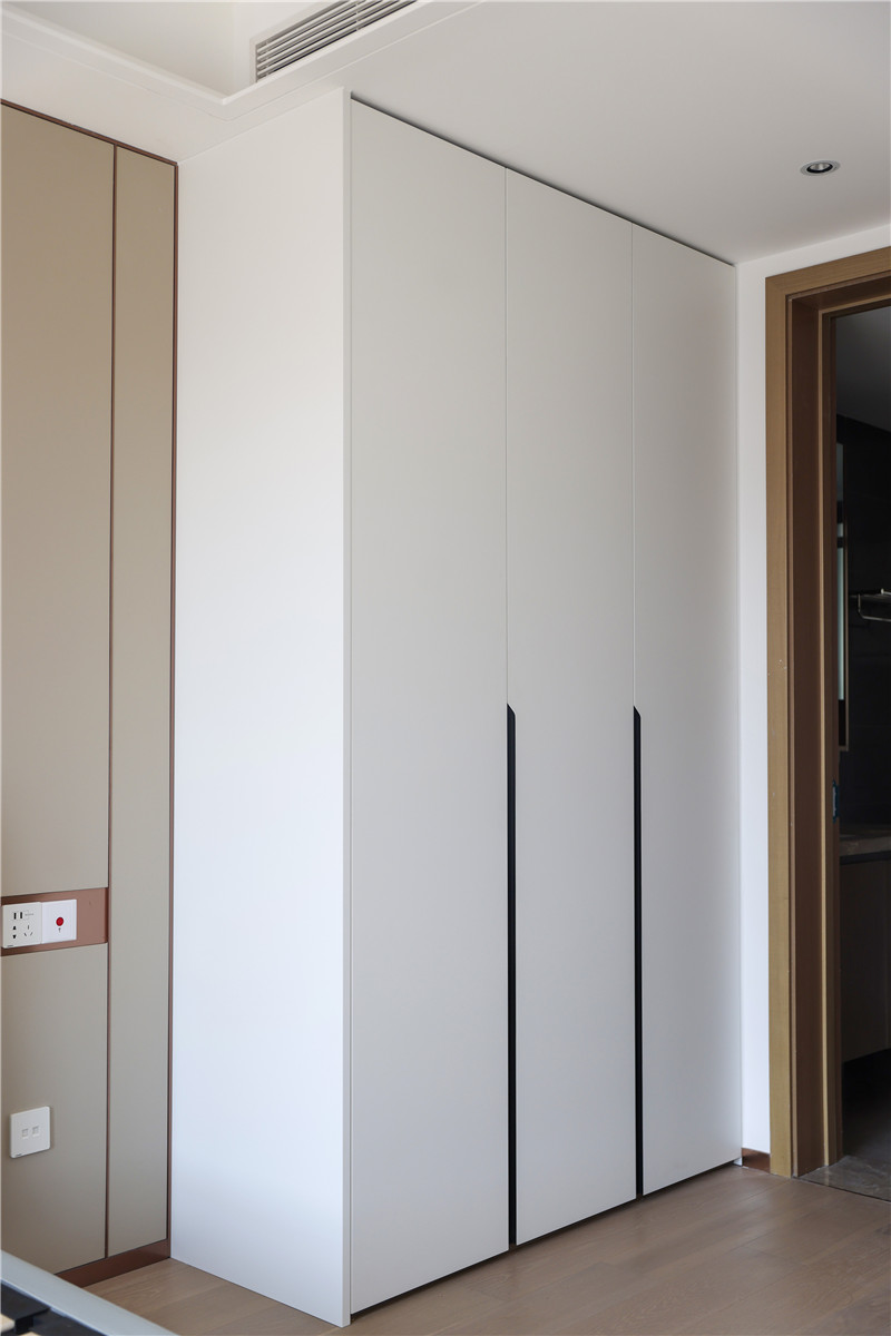 衣帽間整面到頂衣柜,芬蘭白OSB柜體,質(zhì)量靠譜;柜門耐磨、耐腐蝕、抗老化,美觀度高;裝飾性拉手為小扇子形狀,門板對稱,好看雅致。
