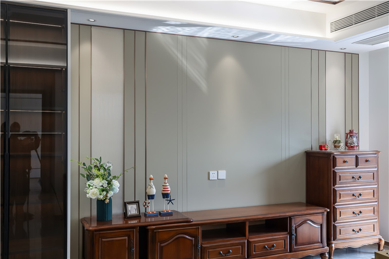 電視背景墻采用整面淺杏色背板,配以金屬色長線條,彰顯時尚感;電視柜為一字型組合柜+獨立柜,深褐色滿滿的中古氣息,其實古銅樣式拉手與造型柜門組合,擁有高級質(zhì)感。