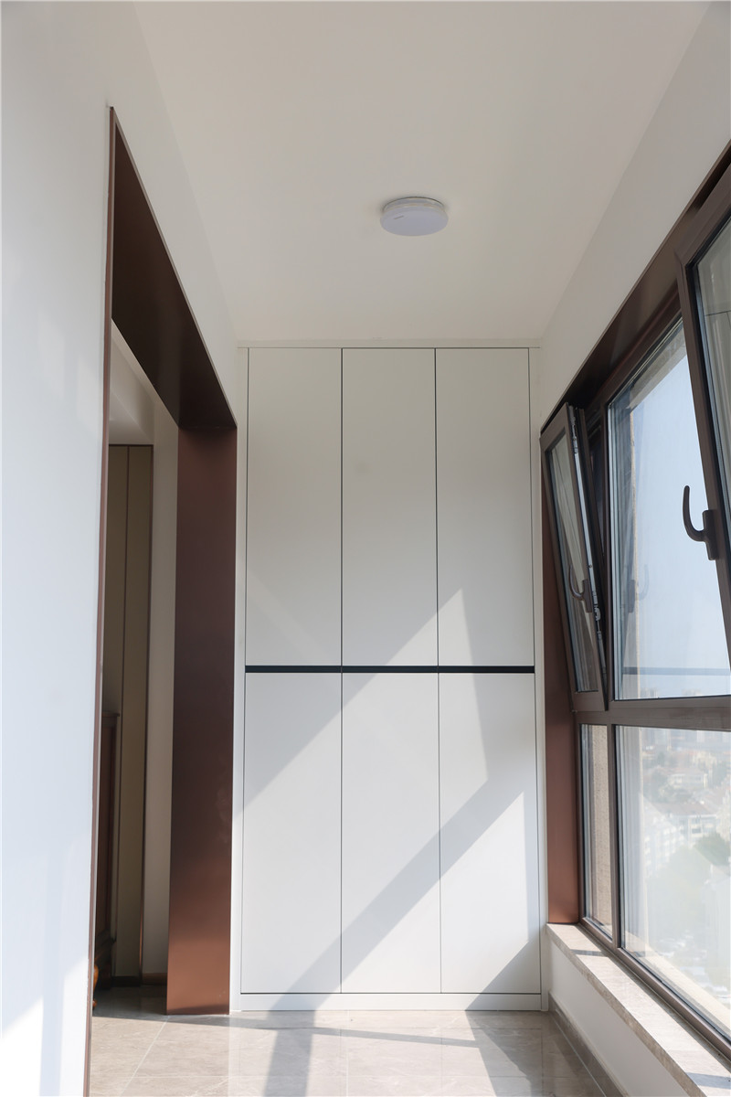 陽臺一側(cè)做小型洗漱區(qū),有效避免上班、上學的洗漱時間沖撞,底部預留區(qū)可放洗衣機;一側(cè)做整面到頂柜,可作為換季衣物存放區(qū);此空間柜體需注意柜體耐黃化及防水性。