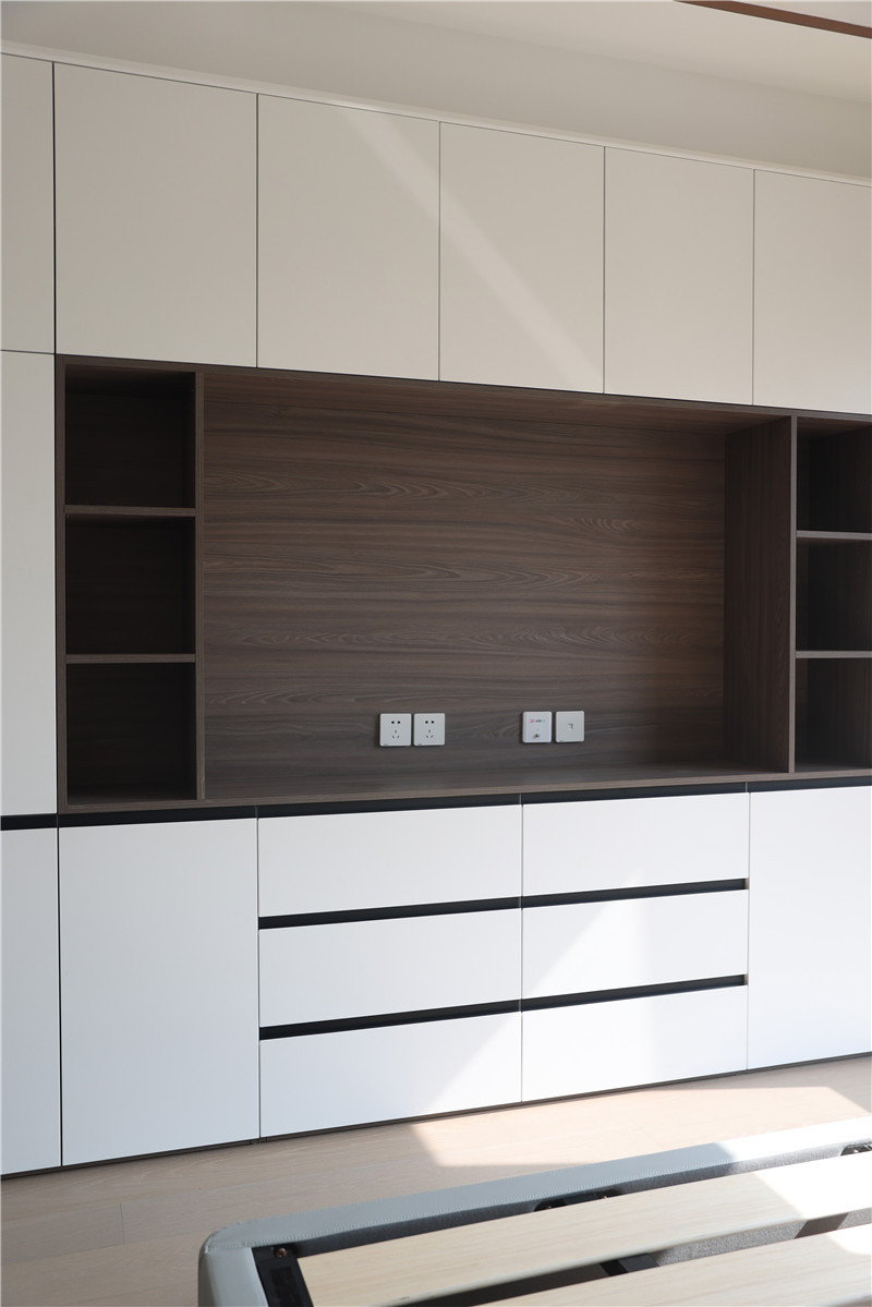 主臥:采用客廳同款背景墻,兩側(cè)預留插座為床頭燈或日常使用;衣柜與電視柜組合,純白與橡木色映襯,使得空間簡約而不簡單;一組整面到頂衣柜,內(nèi)部合理分區(qū)進行有序收納。