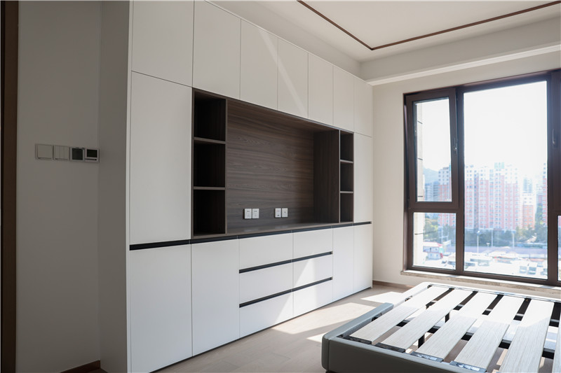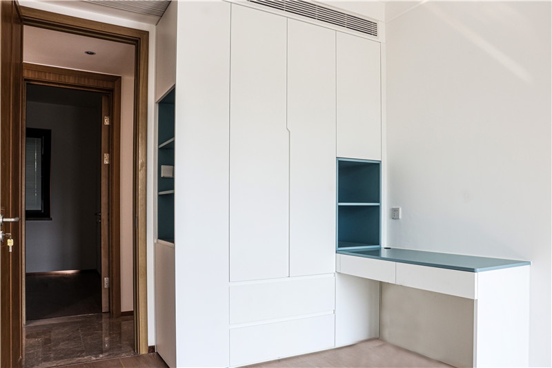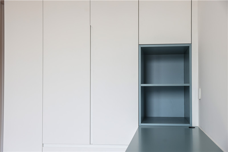 次臥:依舊采用整面到頂衣柜,一側(cè)薄側(cè)柜隔層放裝飾物,一側(cè)柜體延伸做床頭柜,以霧霾藍作為跳色,更顯活潑靈動。