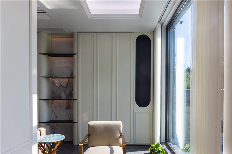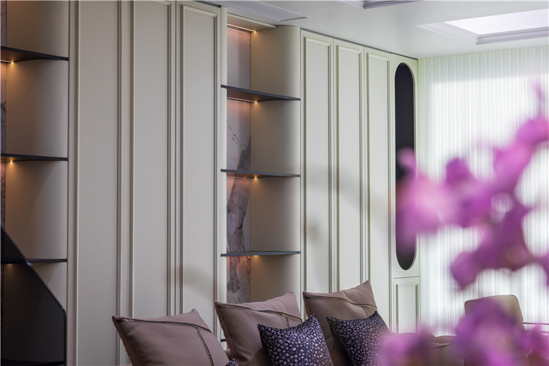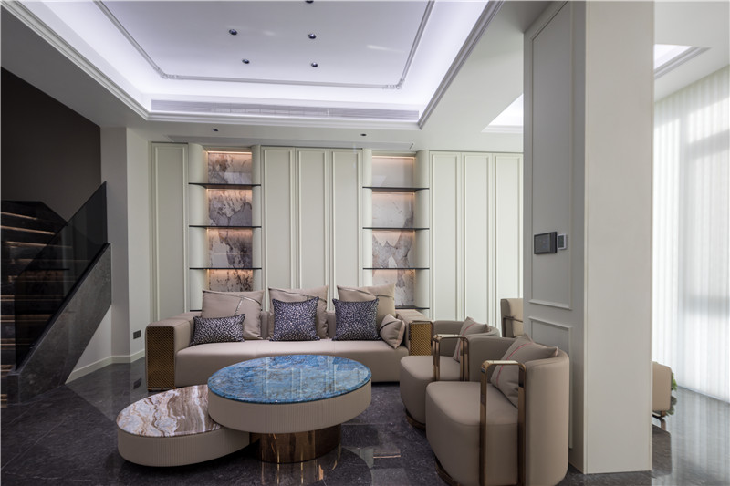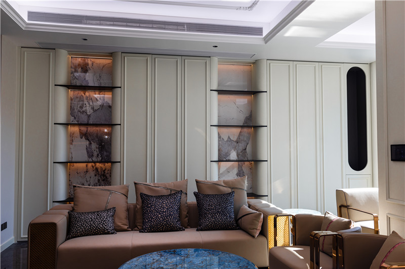 沙發(fā)后側(cè)整面背景墻以圓弧收邊,其間隔嵌入鋁型材隔斷配以暖系燈光及藝術(shù)背板,簡(jiǎn)約舒適;茶幾深藍(lán)調(diào)亮光配以美拉德色沙發(fā),方圓之間致敬傳統(tǒng)古典法式。