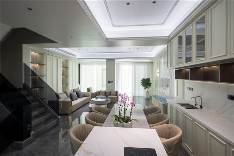 一樓為開放式構(gòu)造,與自然連接互襯,安逸的充實(shí)感為空間的意象表達(dá);整體大橫廳構(gòu)造,一眼望穿的通透是大宅風(fēng)范;光、線、色三者和諧,以居住體驗(yàn)感證明。