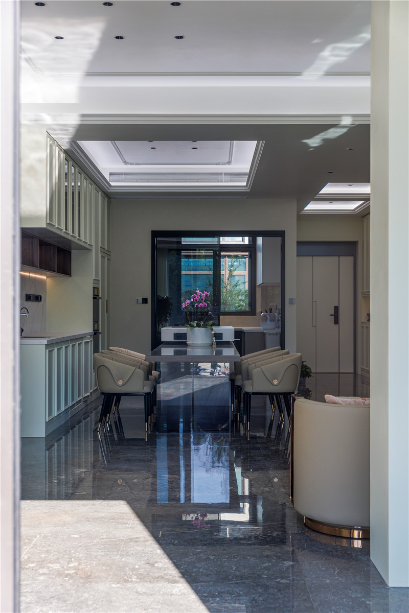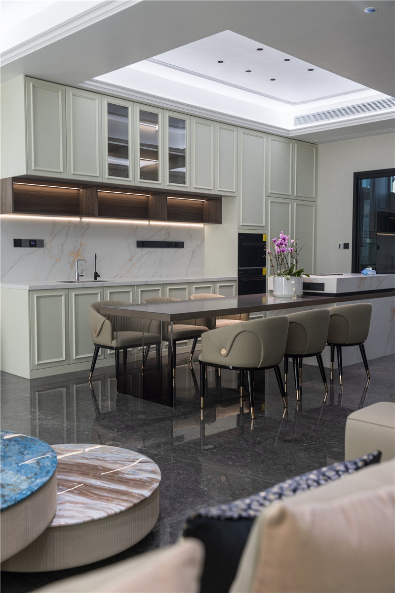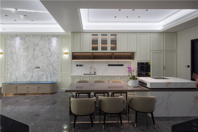 島臺(tái)延伸吧臺(tái),既是用餐空間,也方便家庭成員共同參與其中;島臺(tái)臺(tái)面、烹飪留空處為大理石紋,彰顯高級(jí)質(zhì)感。