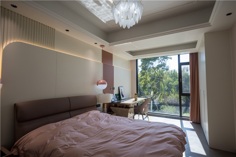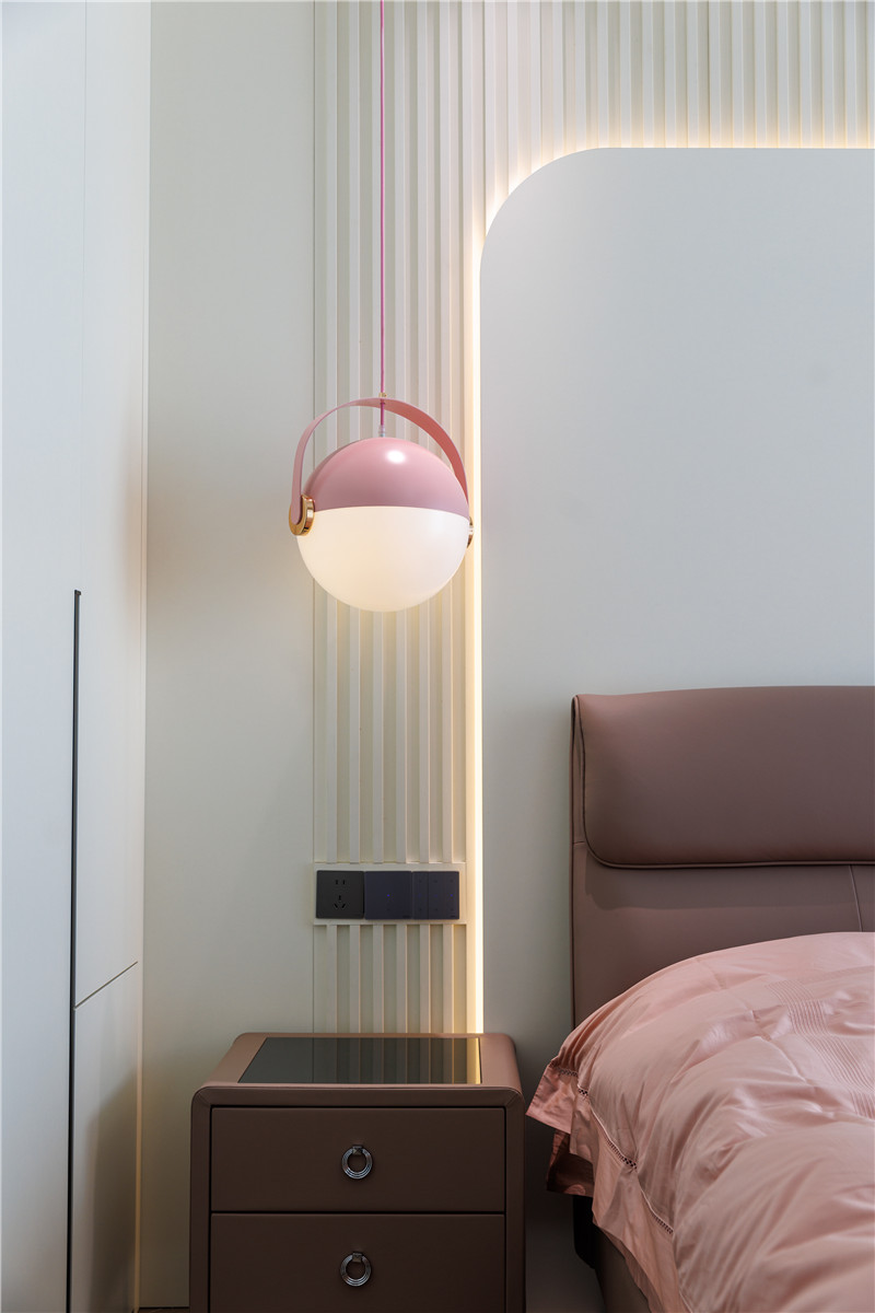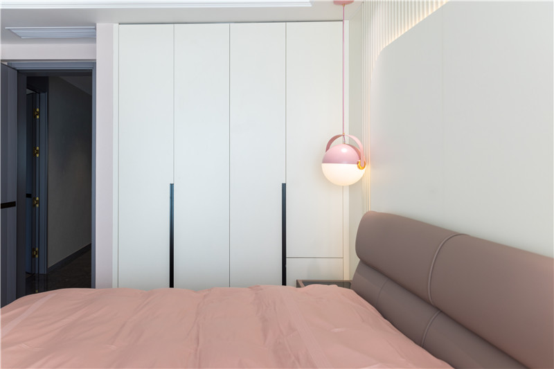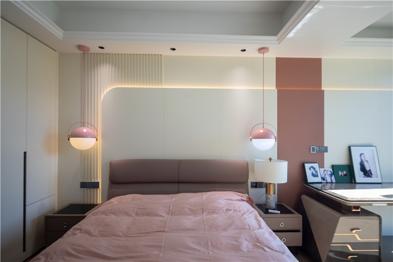 床頭背景墻拼接式構(gòu)造,內(nèi)里為格柵、外側(cè)為圓弧護(hù)墻板,用霧霾粉作為局部點(diǎn)綴,突顯層次美感;復(fù)古主燈與床頭兩側(cè)活潑粉系小吊燈配合,精致少女的小窩有了參考答案;到頂柜、懸浮床頭柜、精致梳妝臺(tái)三者美感在線,讓人心動(dòng)!