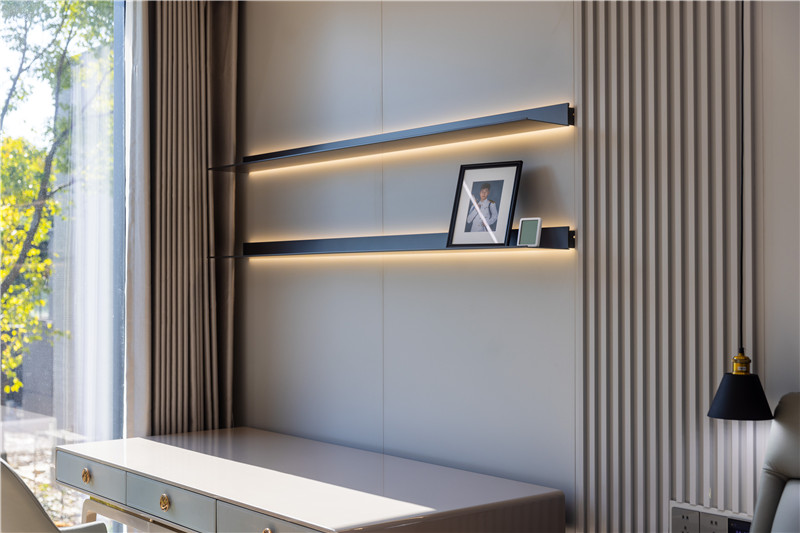 娛樂室以傳統(tǒng)構(gòu)造成為家里的多功能性室,整面無拉手柜體簡(jiǎn)單利落,背板以數(shù)碼板材展現(xiàn)特色性,空間構(gòu)造的精益求精是客來福的裝修態(tài)度。