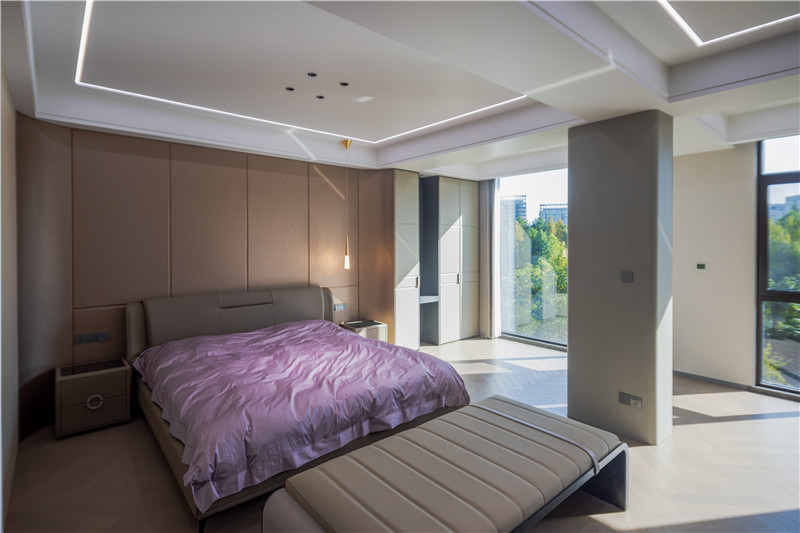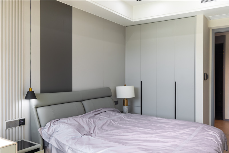 主臥床頭背景墻整體圓弧包邊,以金屬色小吊燈作為局部燈光及細(xì)節(jié)點(diǎn)綴,頗顯時(shí)尚感。