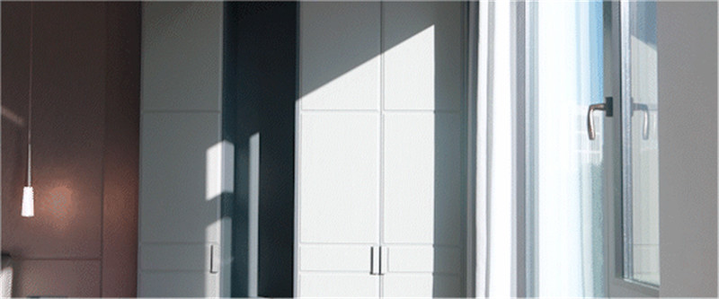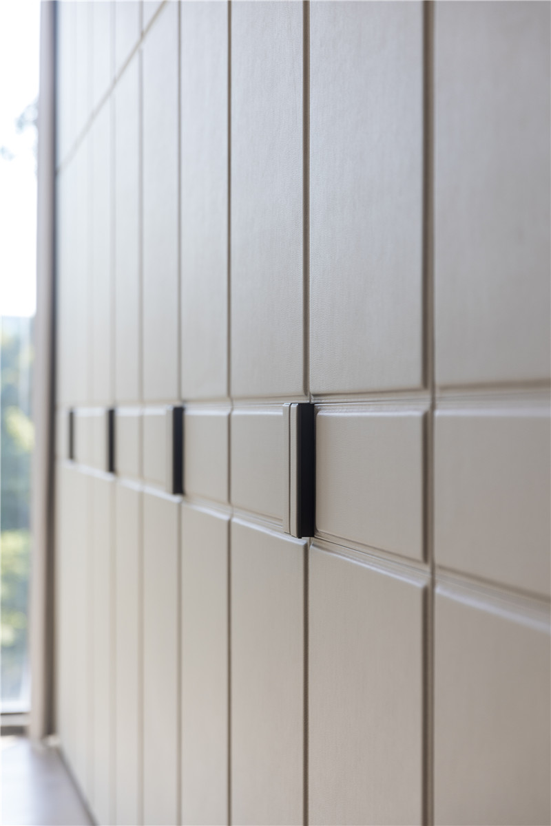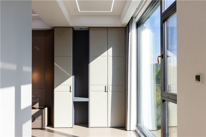 床頭柜圓弧結(jié)構(gòu),其白調(diào)襯托背景板杏調(diào),加上環(huán)形藝術(shù)拉手,細(xì)節(jié)在線;臥室陽臺(tái)以穿插設(shè)計(jì)做到頂陽臺(tái)柜,和諧統(tǒng)一。