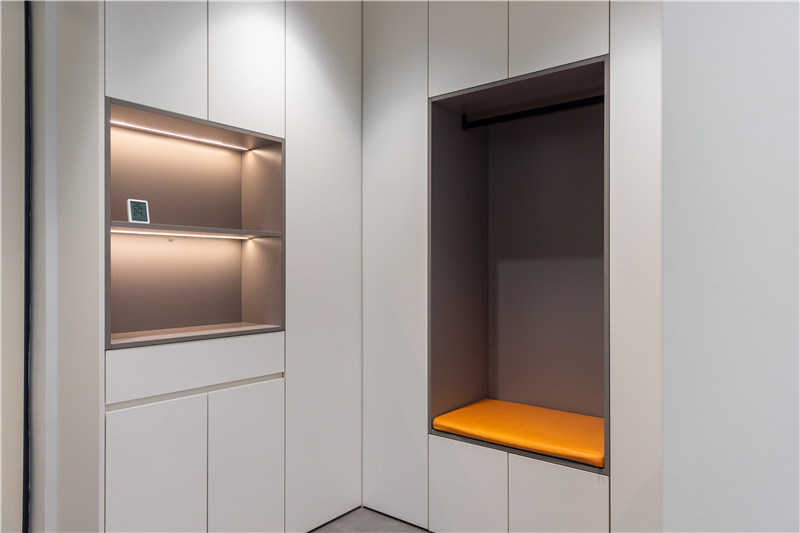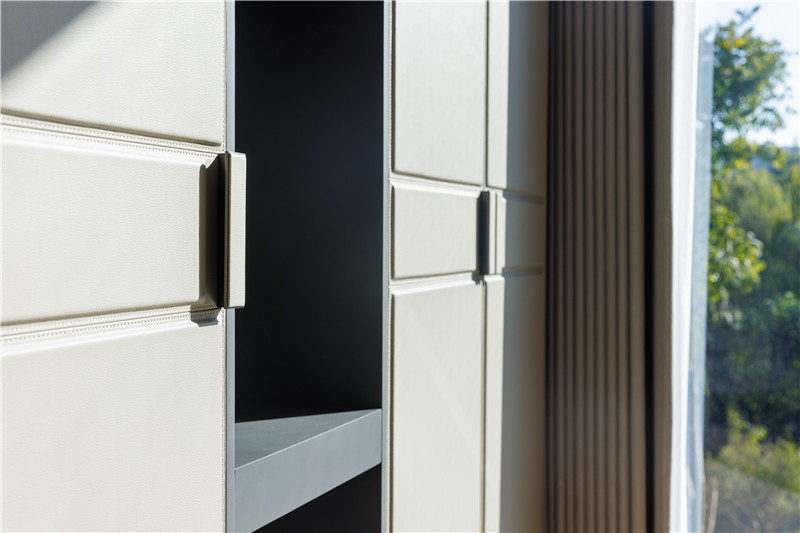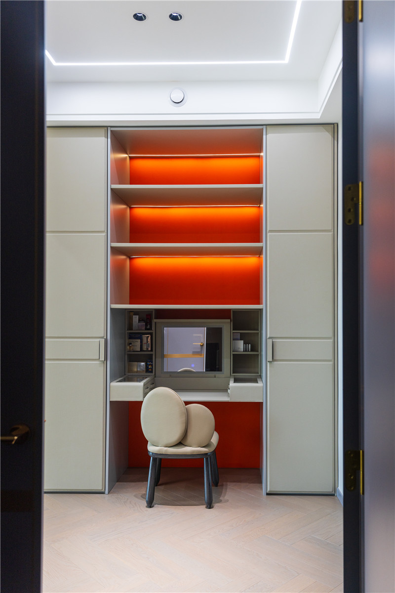 拉手、柜門采用皮革包邊,高端定制的品質(zhì)直接看得見;皮革柜門、玻璃門組合式設(shè)計(jì),視覺效果好;梳妝臺(tái)穿插臺(tái)面智慧構(gòu)造、隔層背板采用活力橙,時(shí)尚好看。