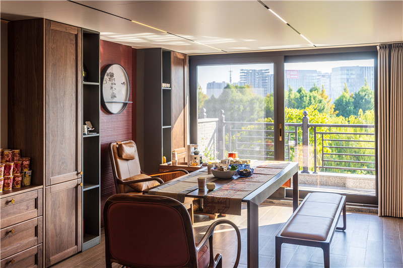 空氣清新、陽光正好、一方閑適。陽臺(tái)柜由沙發(fā)背景墻延伸,桌椅配套客廳空間,讓居者享受自然、與時(shí)光共處。