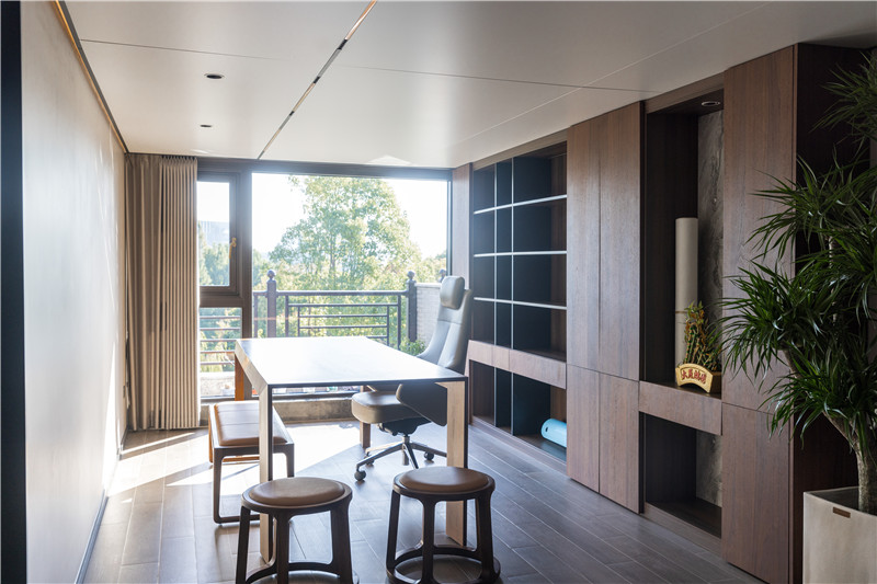 整體對(duì)稱構(gòu)造,輔之以掛畫、擺件等元素,將千年的傳承與空間設(shè)計(jì)融合;柜體及書桌展示木的力量與美,需要品茶著親感;一字型整面組合柜遵循藏八露二原則,收納與美觀性兼具。