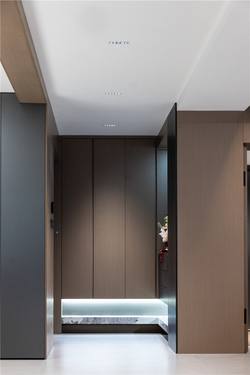 入門(mén)玄關(guān)整體L型構(gòu)造,其懸浮掏空設(shè)計(jì),顯大且具深度;玄關(guān)造型采用內(nèi)退手法,借用臥室空間來(lái)做DIY放置區(qū);將條帶燈光嵌入內(nèi)退區(qū)拐角,明亮通透。