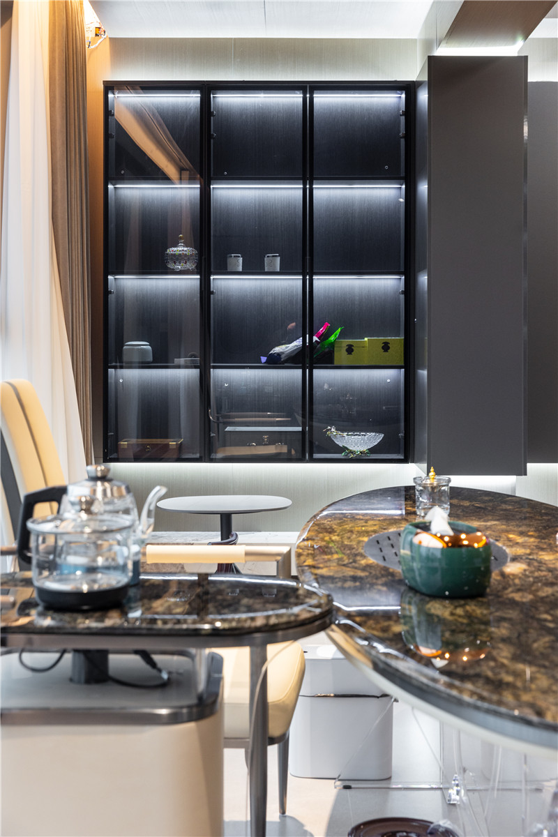 餐桌雙圓弧造型,配合以整面餐邊柜(中部掏空且預(yù)留軌道插座),木與玻璃的組合將收納力有效保障。