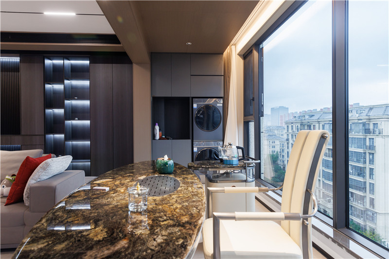 陽(yáng)臺(tái)整體加入獨(dú)立式茶臺(tái),圓弧造型盡顯高級(jí)感,沐浴陽(yáng)光、品茶靜思,真是一件美事。一側(cè)小型洗衣房構(gòu)造,分散家里的洗漱壓力。