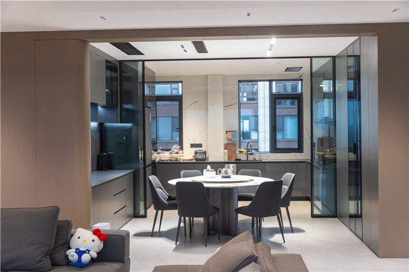餐廚半開(kāi)放式構(gòu)造,以推拉門(mén)做隔斷,兼顧美學(xué)與實(shí)用性。