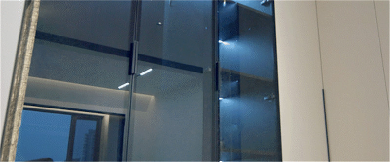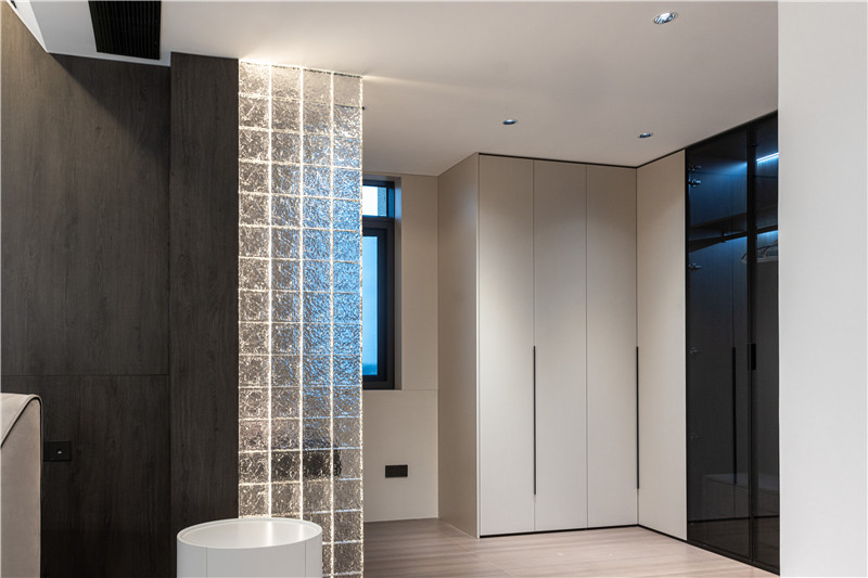 室內(nèi)以夢(mèng)幻玻璃磚隔出一個(gè)衣帽間,梳妝臺(tái)依屋主需求定制高度,側(cè)邊U型立柜作為收納區(qū),展示區(qū)與私密區(qū)區(qū)分,符合人體工程學(xué)設(shè)計(jì)。