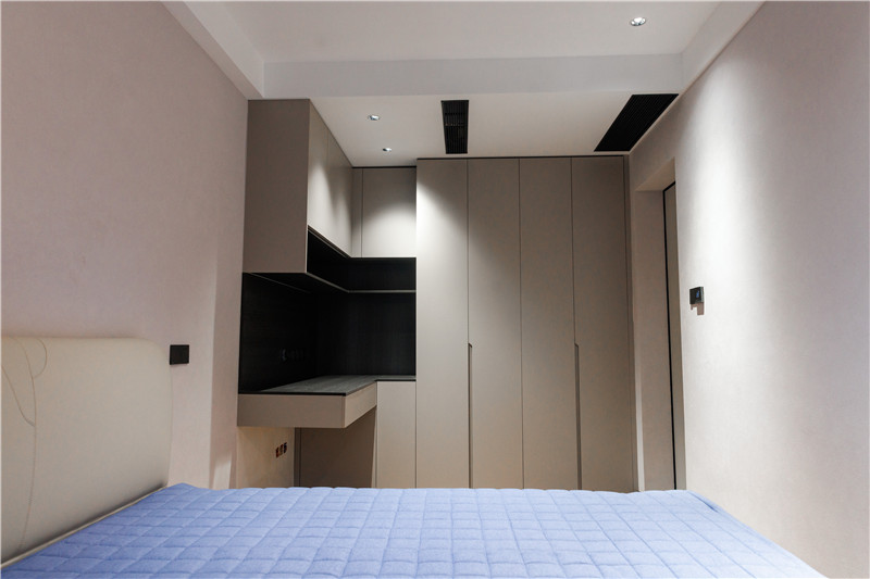 客臥兼書(shū)房使用,衣柜延伸為書(shū)桌,以懸挑設(shè)計(jì)突出特色。墻面采用了藝術(shù)漆,易擦拭,方便屋主整理清潔。