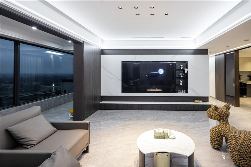 沙發(fā)背景墻為一字型到頂立柜,通過(guò)空間的合理利用增強(qiáng)收納力。