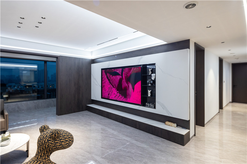 一側(cè)玻璃展示柜,是手辦區(qū)亦是藏酒區(qū);一側(cè)穿插設(shè)計(jì)嵌入燈光,是家里的氛圍區(qū);中部整面立柜,在合適高度掏空并預(yù)留軌道插座,實(shí)用性強(qiáng)。