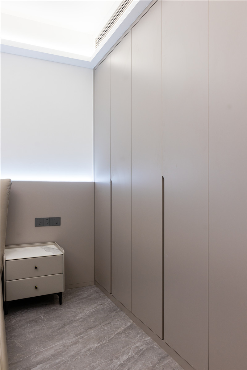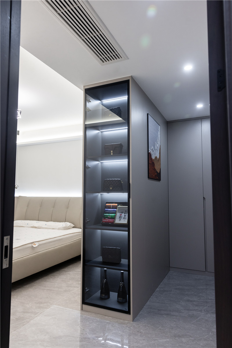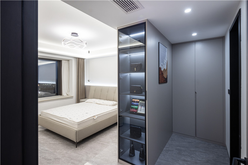 一組衣柜作為隔斷分離出小型衣帽間,一柜雙用突顯設(shè)計(jì)智慧;隔斷柜窄側(cè)玻璃柜展示,與眾不用;內(nèi)側(cè)立柜雙開(kāi),可根據(jù)屋主需求進(jìn)行合理分區(qū),為便捷高效的找尋助力。