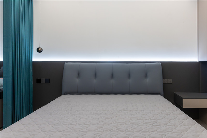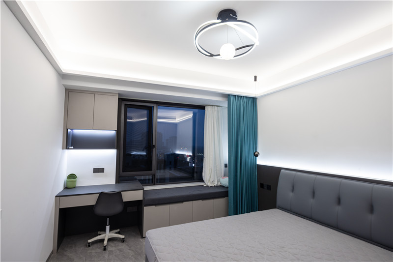 進(jìn)門(mén)靠墻立柜延伸床頭柜,內(nèi)側(cè)色彩協(xié)調(diào)以床頭背景墻,干脆利落;靠窗收納柜與書(shū)桌錯(cuò)位結(jié)合,便捷實(shí)用;整屋主燈與輔燈結(jié)合設(shè)計(jì),氛圍感在線。