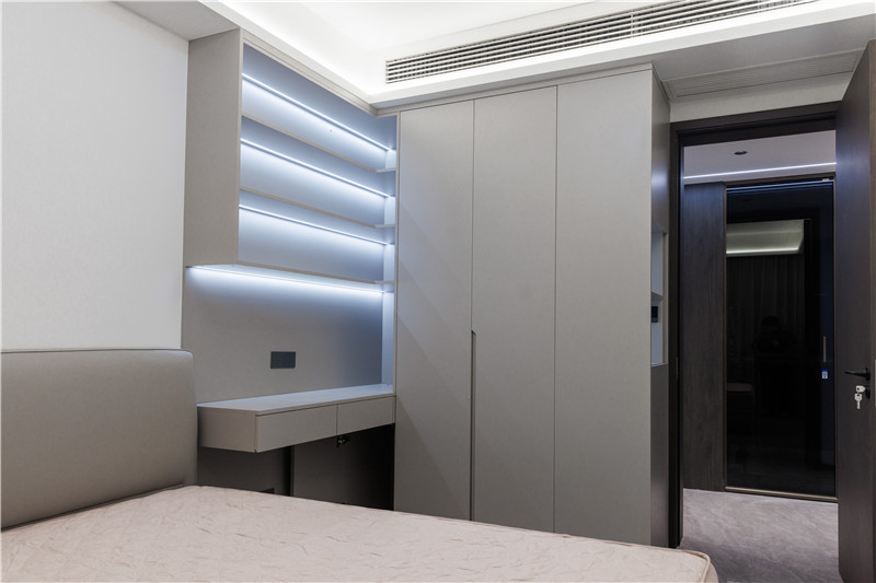 梳妝臺(tái)與床頭柜結(jié)合,上方做開(kāi)放區(qū)并嵌入條帶燈,有效解決視覺(jué)死角問(wèn)題;抽屜做無(wú)拉手,避免梳妝時(shí)的遮擋;側(cè)邊衣柜到頂設(shè)計(jì),邊角做薄側(cè)柜,存儲(chǔ)在線。