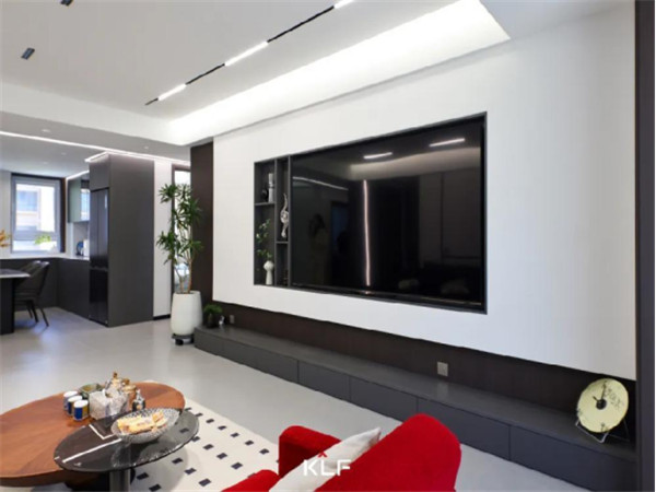 高級灰的色調(diào)在客廳間無限蔓延,開放格電視柜、極簡線條背景墻、無主燈設(shè)計產(chǎn)生簡明的節(jié)奏和呼吸感,娓娓道來,予人舒適優(yōu)雅的寧靜。