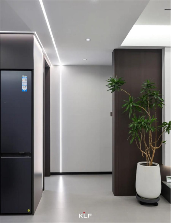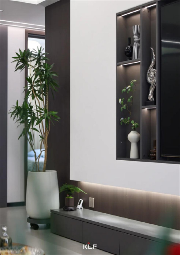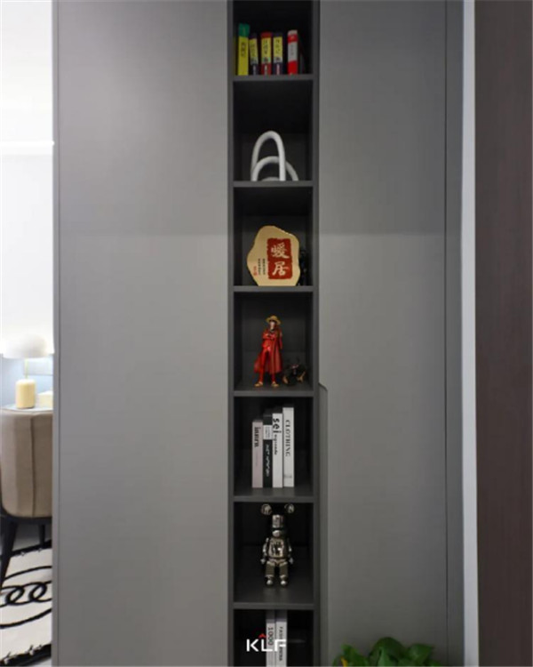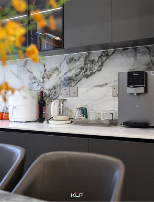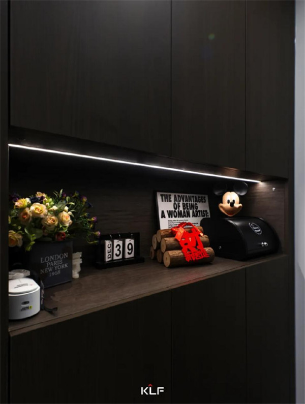 想要做到空間留白與有序收納的平衡,開放式的開放柜與深灰色色彩碰撞,形成不同而合的視觸覺體驗,意式極簡風之下,空間氛圍更顯寬敞。