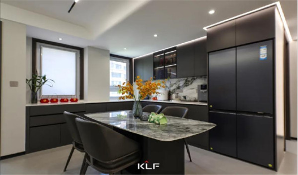 餐廳成開放式狀態(tài),寬廣的臺面和餐椅展露空間的社交屬性,滿足親朋好友的聚餐品酒,櫥柜采用烤漆板,冰箱巧妙嵌入廚房,將精致和觸感演繹。