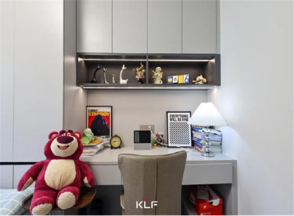 次臥空間與兒童房都在睡眠區(qū)+收納區(qū)的基礎(chǔ)上各自增設(shè)人性化定制的家居產(chǎn)品,兒童房中在床頭設(shè)計的長書桌以及開放式收納格,讓整個房間功能更為豐富。