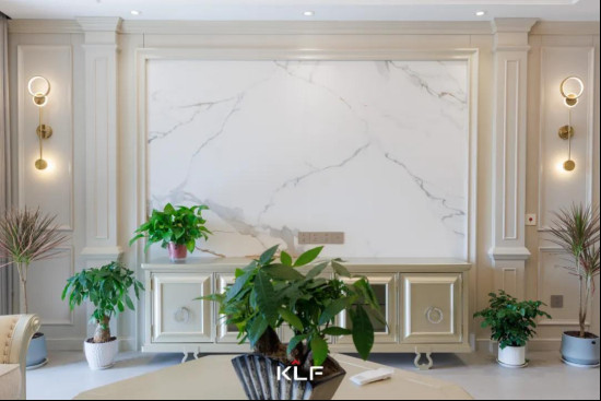 水漆茶白背景墻搭配巖板設(shè)計(jì),細(xì)膩的紋理質(zhì)感,利落的線條,展現(xiàn)空間的復(fù)古簡約。兩側(cè)壁燈和頂部吊燈,渲染溫馨氛圍,打造現(xiàn)代簡約溫暖家。