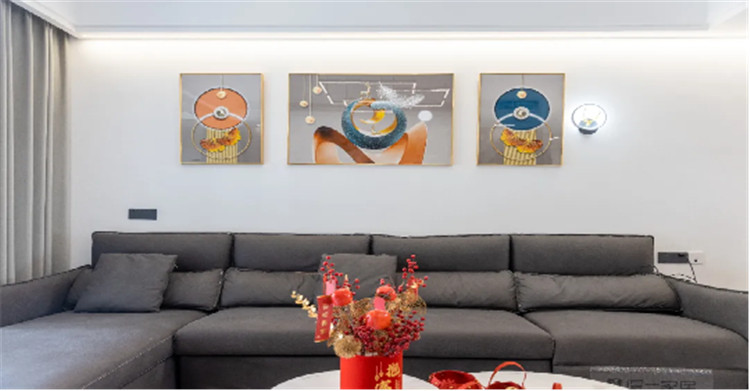 在沙發(fā)背景墻這一面,屋主則是選擇懸掛幾幅喜愛(ài)的掛畫(huà),這樣的裝飾手法很常見(jiàn),也很靈活,可以根據(jù)屋主的喜好隨時(shí)改變,更為現(xiàn)代。