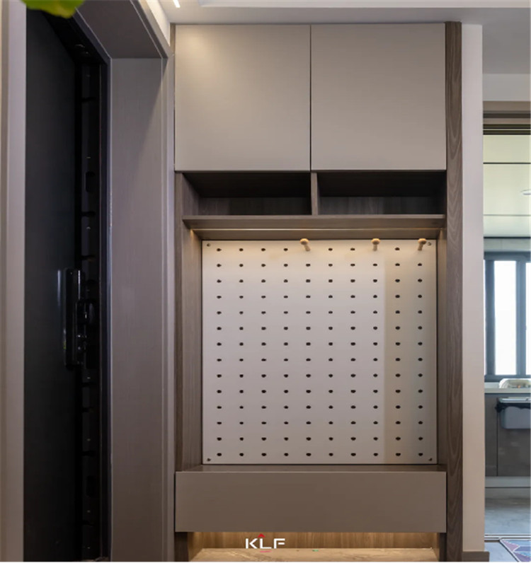 入戶(hù)在有限的空間中我們更注重整潔的收納,上方做吊柜,中部做抽屜進(jìn)行組合式儲(chǔ)物,屋主在背板上使用了洞洞板進(jìn)行小物品的存放,也是提高空間利用率的一種形式。