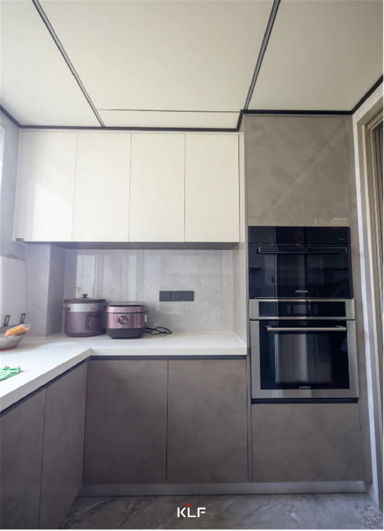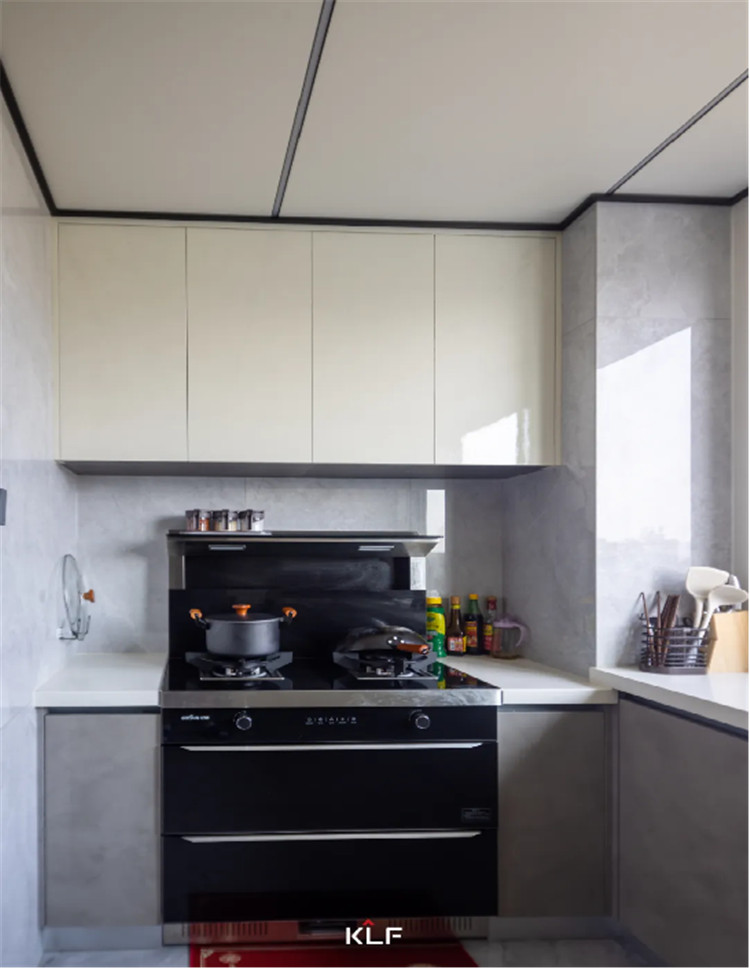 U型結(jié)構(gòu)的廚房設(shè)計(jì)更注重物品的收納,這種常規(guī)的吊柜+地柜的多重儲(chǔ)物空間,正是能促成有序整潔的環(huán)境。吊柜采用伊麗莎白,亮面材質(zhì)也很容易清潔。