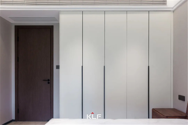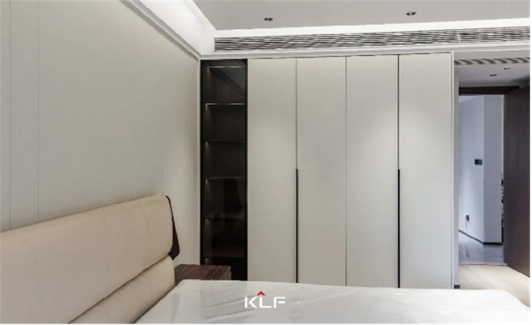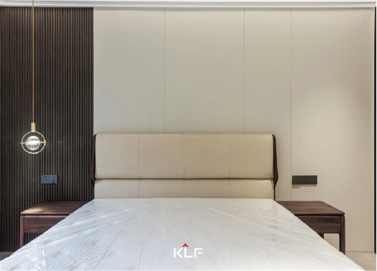 主臥空間延續(xù)一貫簡(jiǎn)約的設(shè)計(jì)手法,注重提升家居質(zhì)感,強(qiáng)調(diào)人文的居住感受。自客廳格柵背景墻延伸至臥室空間,做成一體化的門(mén)套門(mén)框及門(mén)扇。