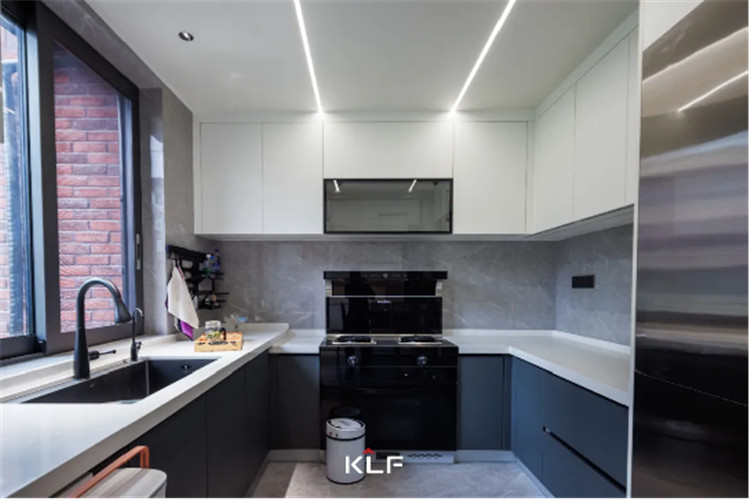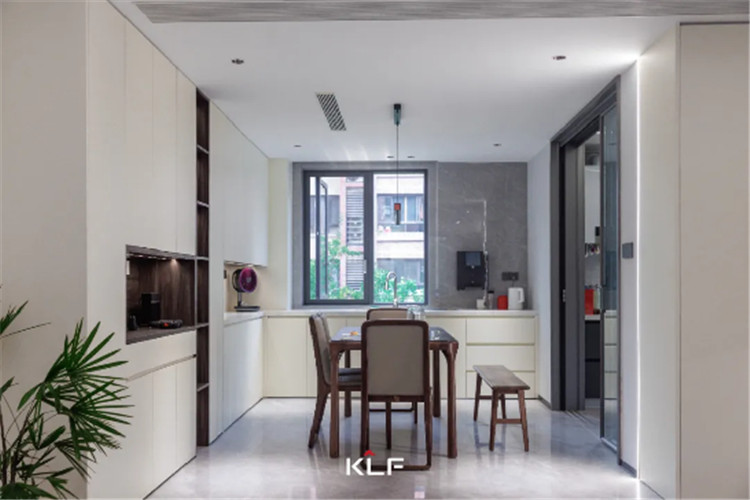 餐廚空間的設(shè)計(jì)風(fēng)格與起居空間保持一致,除了傳統(tǒng)的U型封閉式中廚外,在用餐區(qū)還做了高定全屋圍合的設(shè)計(jì)。